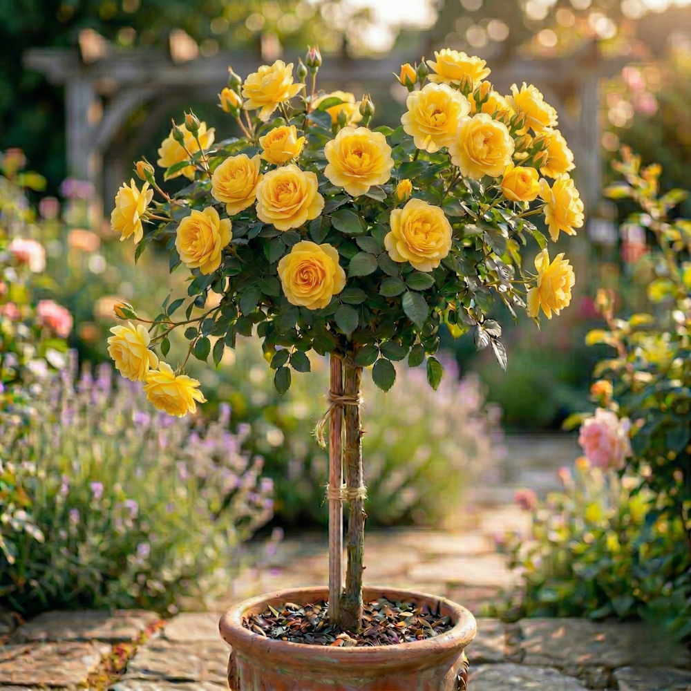 🌹 Floare: Galben intens, strălucitor, coroană bogată.Trandafirul Copac Galben este o piesă de rezistență în designul peisagistic. Altoit pe un trunchi înalt și robust, acesta dezvoltă o coroană bogată, sferică, plină de flori galben-intens, strălucitoare. Este ideal pentru a marca intrările, pentru a crea alei simetrice sau ca punct focal în centrul unui rond de flori. Oferă vizibilitate și eleganță la nivelul privirii.