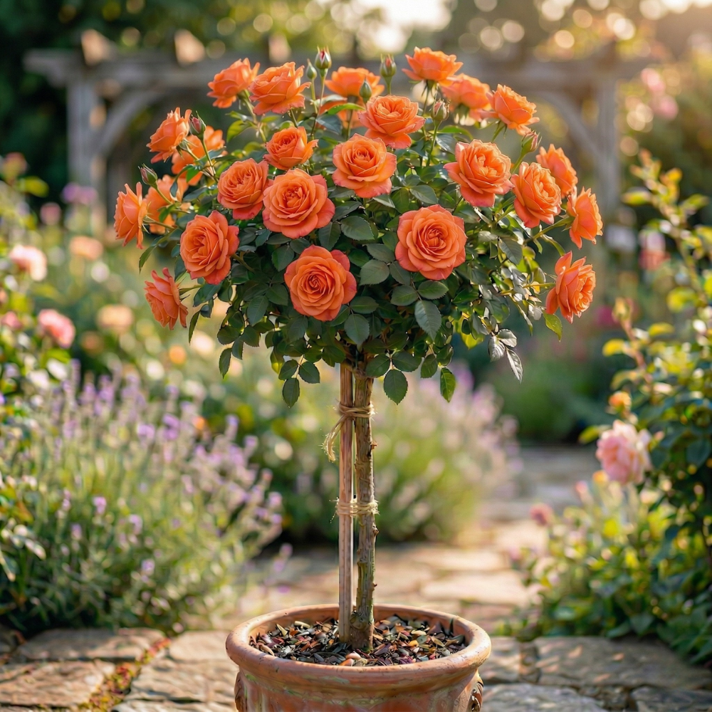 🌹 Floare: Portocaliu intens, atrage imediat privirea.Trandafirul Copac Portocaliu aduce un strop de energie și exotism grădinii. Coroana sa se încarcă cu flori de un portocaliu vibrant, care contrastează superb cu verdele frunzișului. Altoit pe picior înalt, acest trandafir este perfect pentru a adăuga înălțime și structură straturilor de flori joase sau pentru a fi cultivat în ghivece mari, ceramice, pe terase însorite.