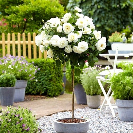 Trandafirul Copac Alb (Roze Pienna) este simbolul purității și al eleganței clasice. Altoit pe un trunchi drept și înalt, acesta formează o coroană sferică densă, presărată cu flori de un alb imaculat. Este ideal pentru grădinile formale, pentru a marca o intrare sau pentru a fi cultivat în ghivece ceramice mari pe terase. Florile albe reflectă lumina lunii, fiind superb și seara.
