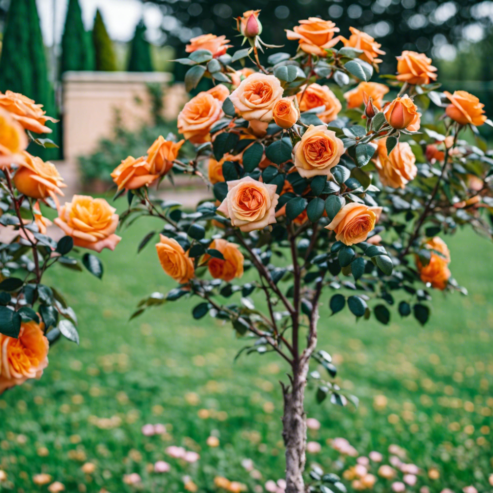 🌹 Floare: Portocaliu intens, atrage imediat privirea.Trandafirul Copac Portocaliu aduce un strop de energie și exotism grădinii. Coroana sa se încarcă cu flori de un portocaliu vibrant, care contrastează superb cu verdele frunzișului. Altoit pe picior înalt, acest trandafir este perfect pentru a adăuga înălțime și structură straturilor de flori joase sau pentru a fi cultivat în ghivece mari, ceramice, pe terase însorite.